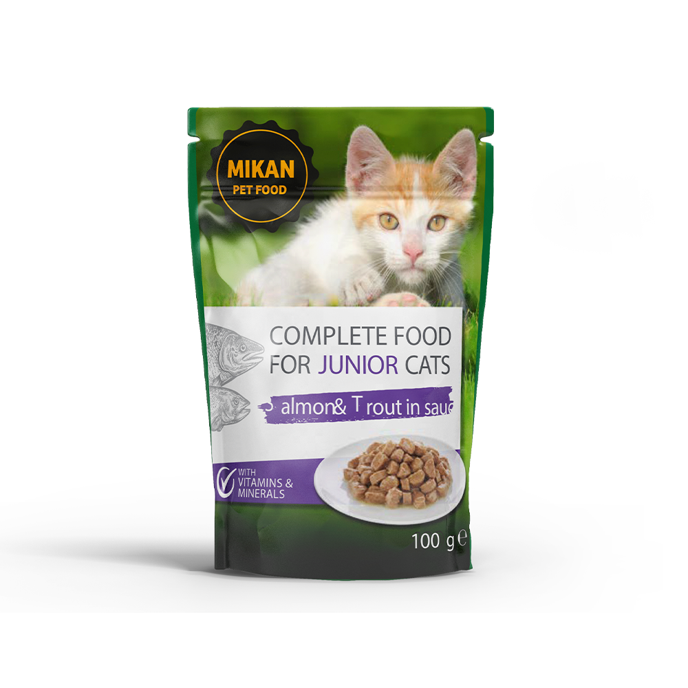 Hrană umedă pentru pisici junior cu somon și păstrăv 100g