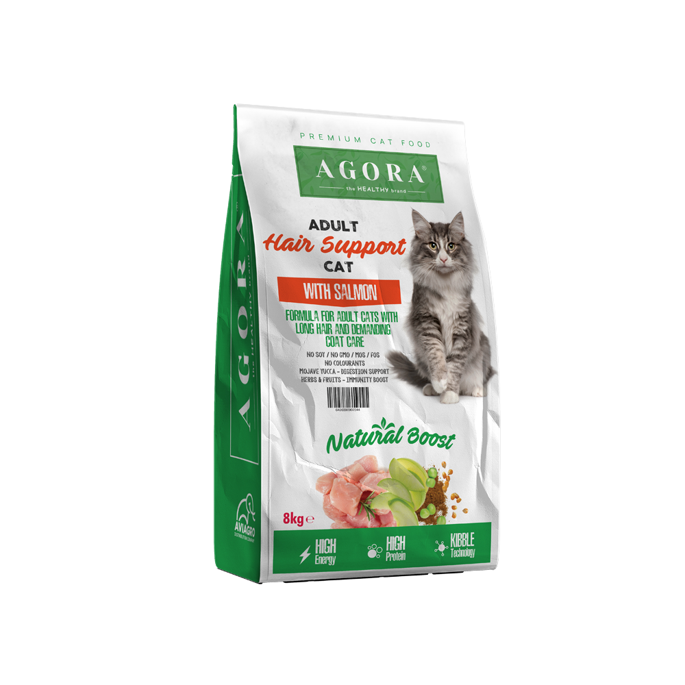 Agora CAT Adult Hair Support este concepută special pentru pisicile adulte care au nevoie de suport anti-hairball. Formula conține lignoceluloză pentru reducerea formării ghemotoacelor, proteine de somon și ulei de somon pentru aport optim de omega-3, plus un mix de plante și fructe pentru imunitate. Cu ingrediente naturale și fără soia, OMG sau coloranți, această hrană asigură digestie excelentă și o blană sănătoasă și strălucitoare.