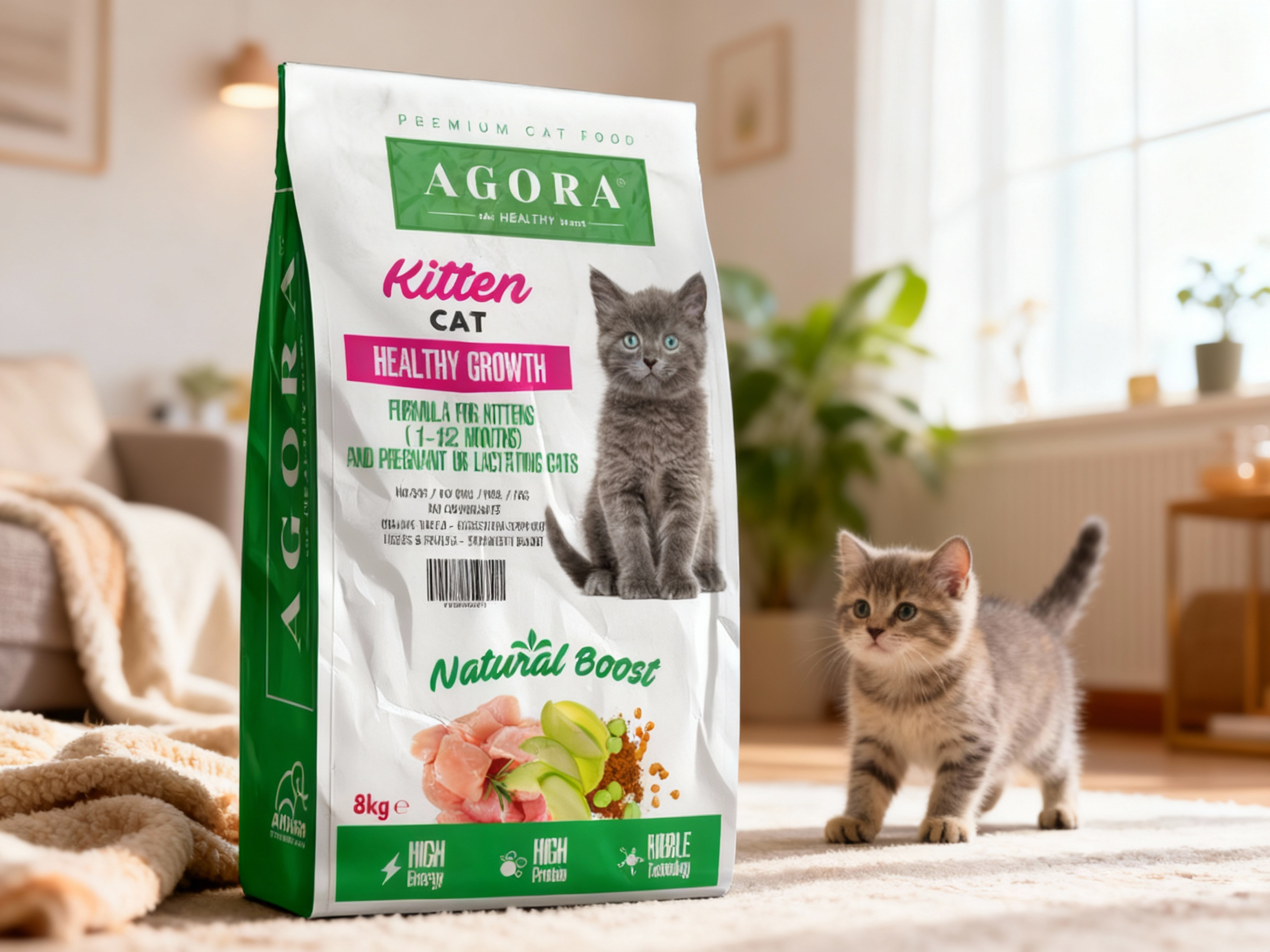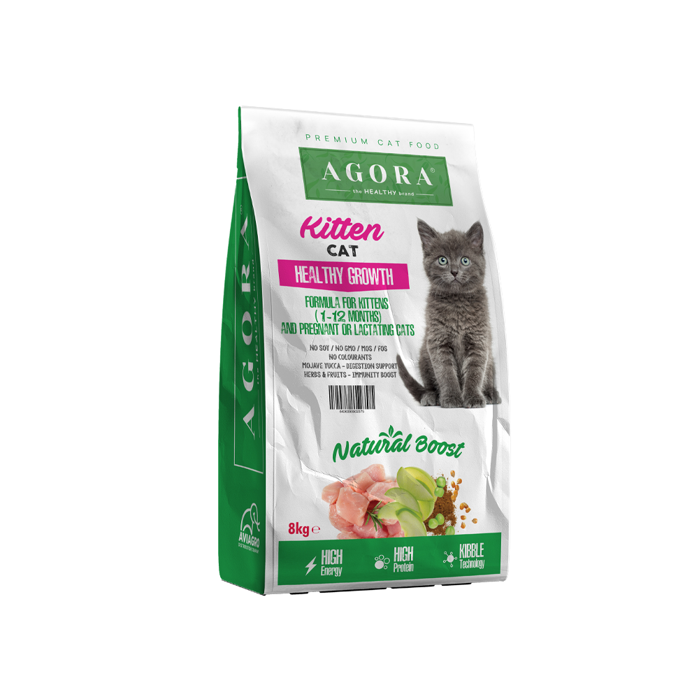 Agora CAT Kitten este special formulată pentru pisoi cu vârsta între 1 și 12 luni, oferind aportul ridicat de proteine și grăsimi necesar dezvoltării optime. Conține 45% proteină de pui, vitamine esențiale, MOS, FOS și yucca Mojave pentru o digestie sănătoasă încă din primele luni de viață. Fără soia, OMG și coloranți, rețeta sprijină imunitatea și dezvoltarea armonioasă a pisoiului.