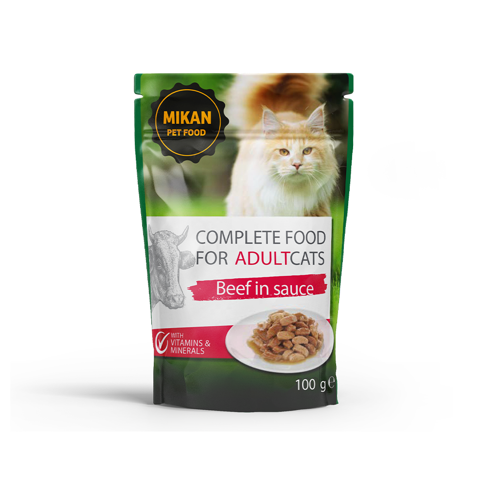 Răsfățați pisica dvs. cu mâncarea delicioasă de la Mikan, un furaj complet pentru pisici adulte, în sos savuros cu vită. Acest produs este formulat pentru a asigura o nutriție echilibrată și sănătoasă, sprijinind astfel starea de bine și energia companionului dvs. felin.